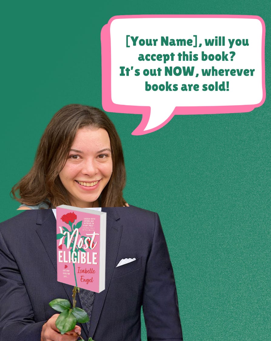 Most Eligible is a romance at its core, but it’s also a love letter to reality TV and strong female friendships. Reality TV, and especially reality TV that revolves around romance, is often referred to as a “guilty pleasure,” or something that’s not high-brow enough to admit to enjoying. It’s also something that is stereotypically thought of as being enjoyed by women, which I don’t think is a coincidence. (More on this in a future newsletter, maybe!) When I wrote Most Eligible, I had a lot of fun toying with the idea of what’s real and what’s fake on reality TV shows like The Bachelor. I made choices about which contestants were there “for the right reasons,” which lines were scripted or natural, but the one aspect that I was sure I wanted to be genuine was how badass the female contestants were and how real the friendships they formed are. These (fictional) women are ready to take on the world and I can’t wait for you to meet them.